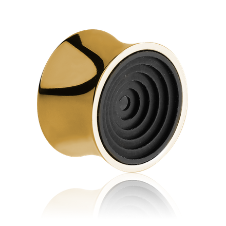 Тоннели из хирургической стали 316L с золотым PVD покрытием. Оформлены чёрными концентрическими кругами в перспективе.