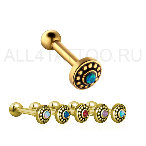 Микроштанга из хирургической стали 316L с внутренней резьбой, покрытие - 24х каратное золото. Украшена ярким опалом. Диаметр диска 4мм.
