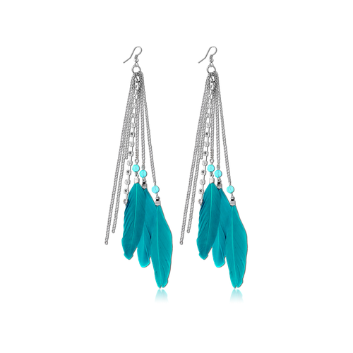 Серьги из хирургической стали 316L с эффектной подвеской из окрашенных перьев, цепочек и страз. Общая длина декоративной части - 19cм.
