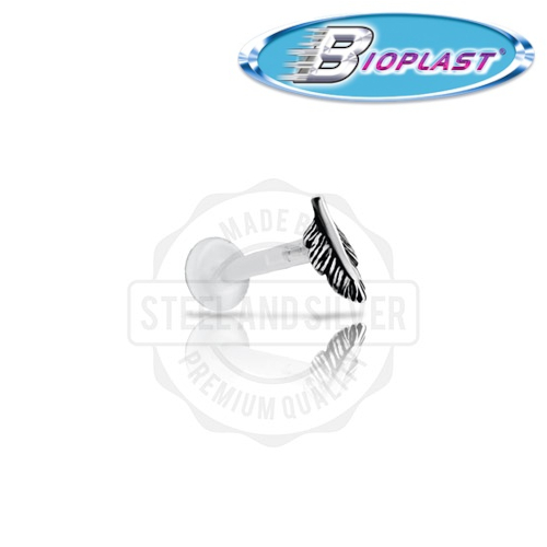 Лабрет из материала Bioplast со вставкой в форме пера из хирургической стали 316L. Параметры пера - 3х8 мм.