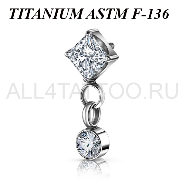 Накрутка из имплантационного титана 6Al-4V-Eli ASTM: F-136 с квадратным фианитом в лапках и дополнительной подвеской с круглым фианитом. Размер декоративной части: 4,5х12мм. Подходит для украшений с внутренней резьбой толщиной 1 и 1,2 мм.