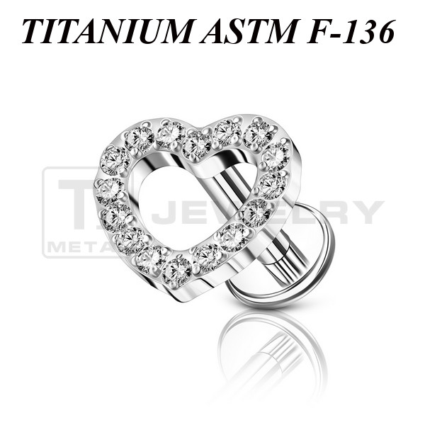 Лабрет из имплантационного титана 6Al-4V-Eli ASTM: F-136 с накруткой в форме сердца, украшенного прозрачными фианитами. Представлен в двух вариантах: классичесий титановый и с золотым PVD покрытием. Размер декоративной части: 7х6,5мм.
