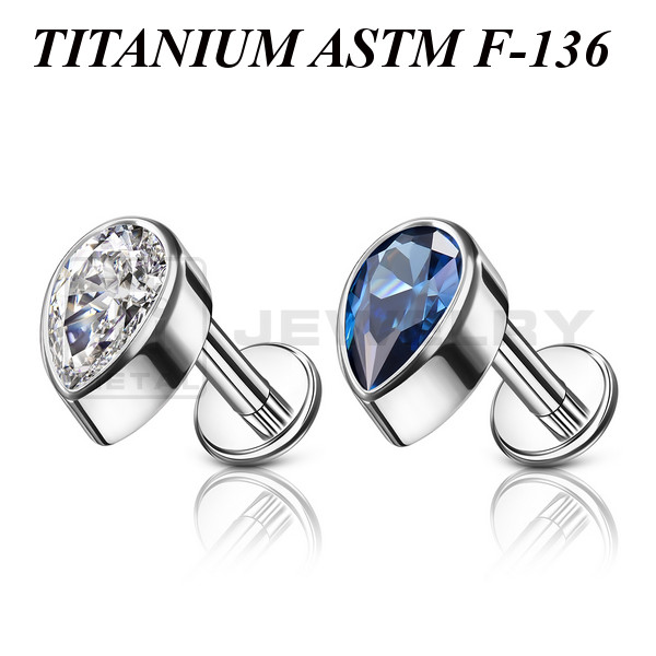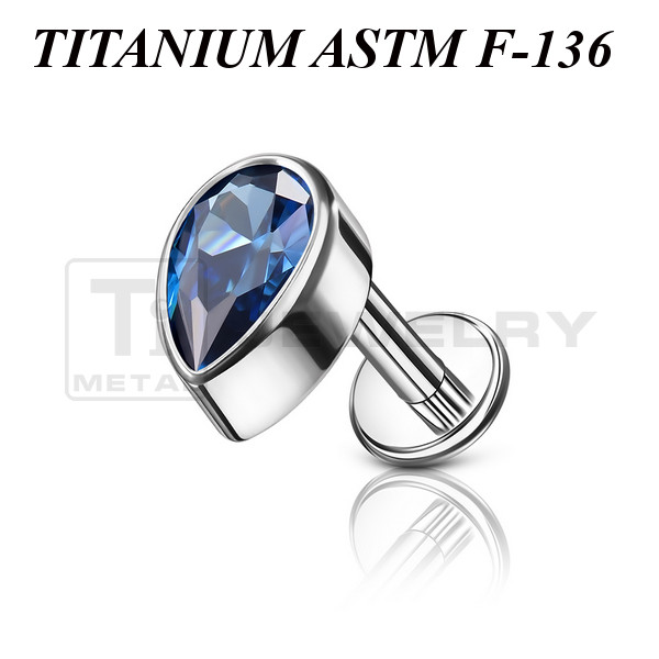 Лабрет из имплантационного титана 6Al-4V-Eli ASTM: F-136 с внутренней резьбой. Украшен накруткой в форме капли с фианитом. Размер накрутки: 4,4х6мм.